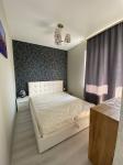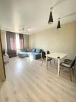 Евродвушка с ремонтом и мебелью в современном доме. Квартира распланирована в просторную спальню с выходом на балкон, большую гостиную, гардеробную и выделенную зону кухни.