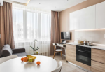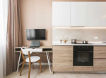 Кухня-студия (обеденная зона, раскладной диван, ТВ зона, рабочее место, большая кухня).