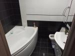Зручна кутова ванна, система (підвісний унітаз), умивальник з меблями та пенал.