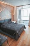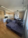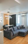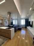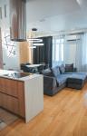 Кухня-студия с островом, две гардеробные комнаты, два санузла, две спальни с видом на Парк Победы.