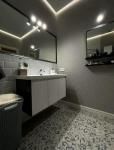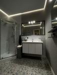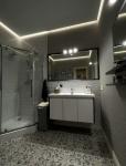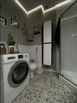 Просторный санузел облицован современной плиткой, установлена душевая кабина, стиральная машина.