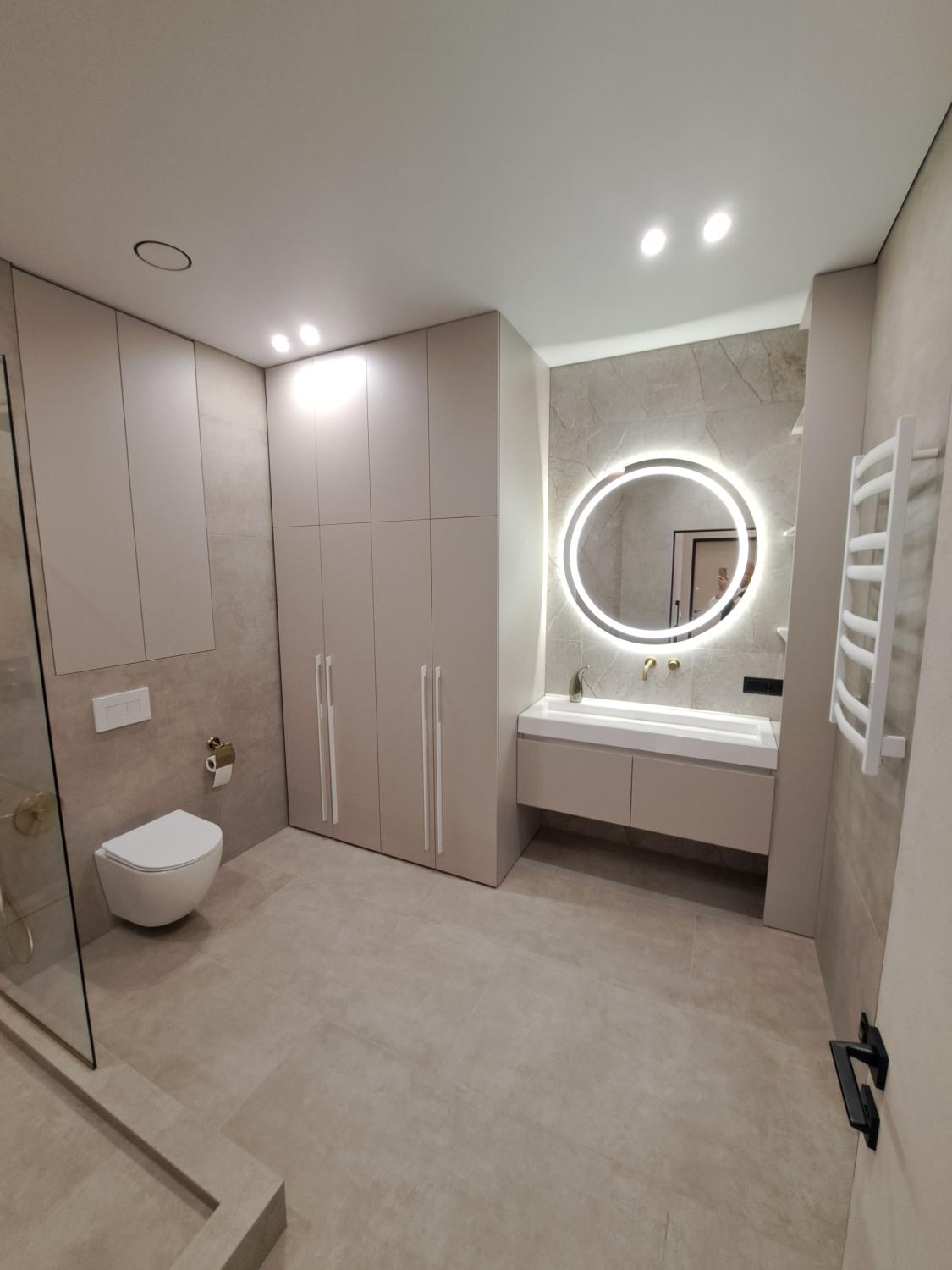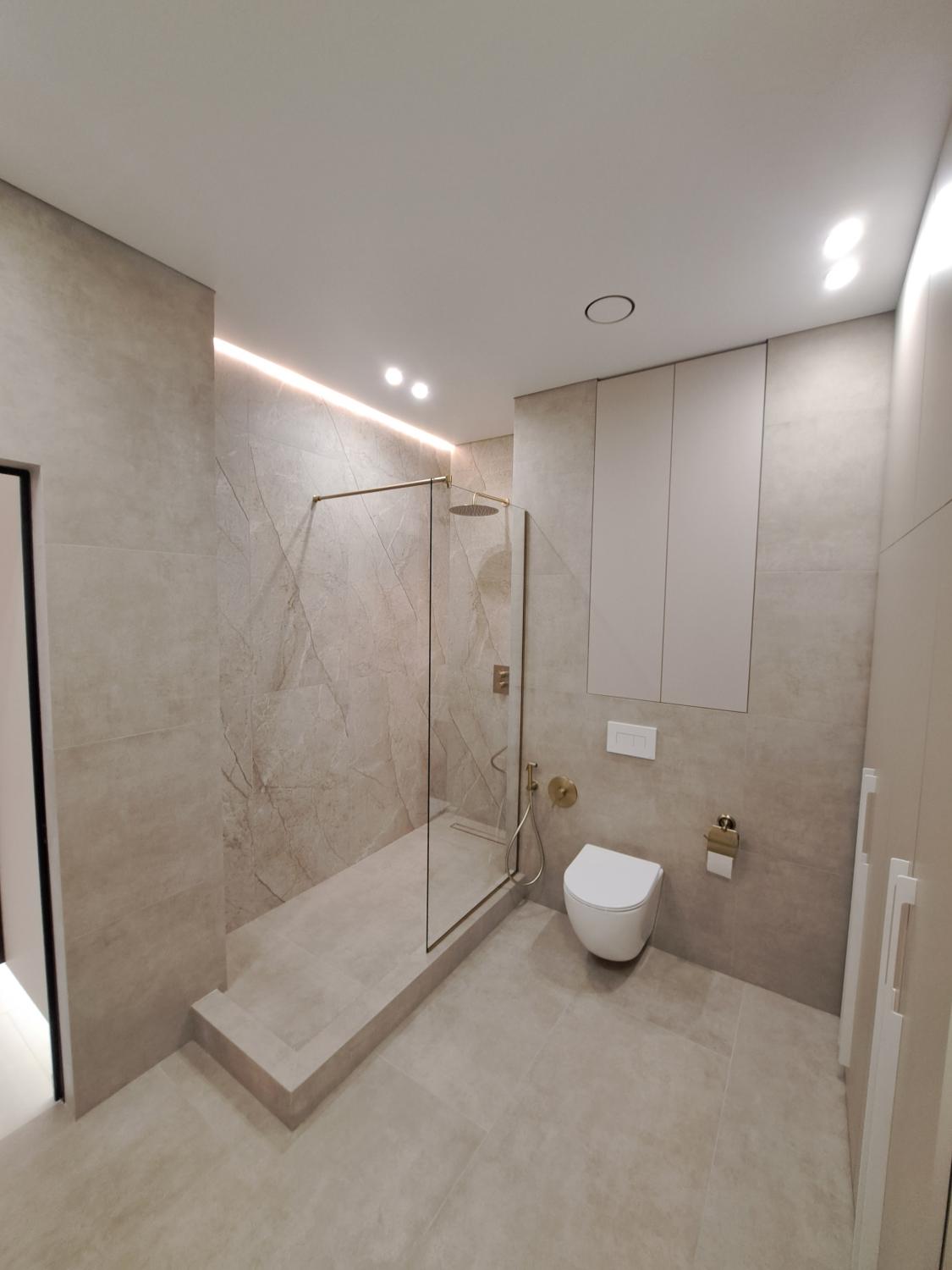 Установлены теплые полы, двери скрытого монтажа, фактурные стены, сан. техника высокого качества.