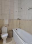 Санузел облицован современной плиткой, установлена ванна и бойлер для горячей воды.