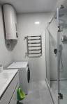 Санузел облицован плиткой, установлена душевая кабинка и бойлер.