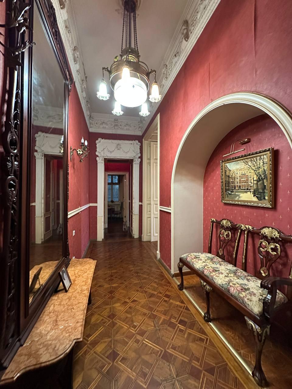 Внешний интерьер квартиры поддерживался в историческом аутентичном стиле. Потолки с лепниной, наборные паркетные полы.