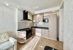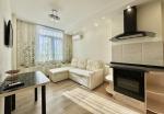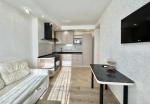 Кухня-студия: полностью укомплектована мебелью и техникой Ariston (встроенный холодильник, посудомоечная машина, духовка, варочная поверхность), вытяжка Fabiano (Италия), микроволновка Liberton, кондиционер Gree, ТВ LG 32”, стильный диван.