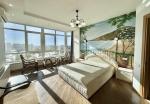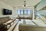 Спальня: встроенный шкаф, двуспальная кровать на заказ, ТВ Sony 48”, ротанговая мебель, дизайнерское освещение.
