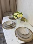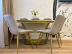 • Стильный раскладной диван, стол со стульями на золотых ножках, мраморная столешница;