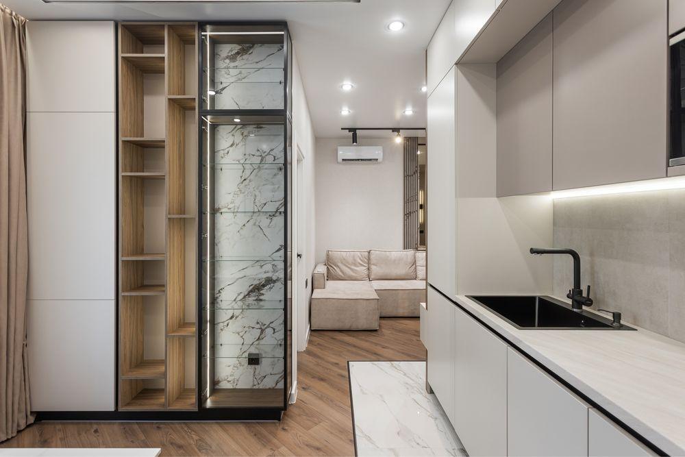 Грамотно спланировано пространство - кухня -гостиная и отдельно спальня. Техника и мебель высокого качества,которые вмещают в себя ниши для хранения вещей.