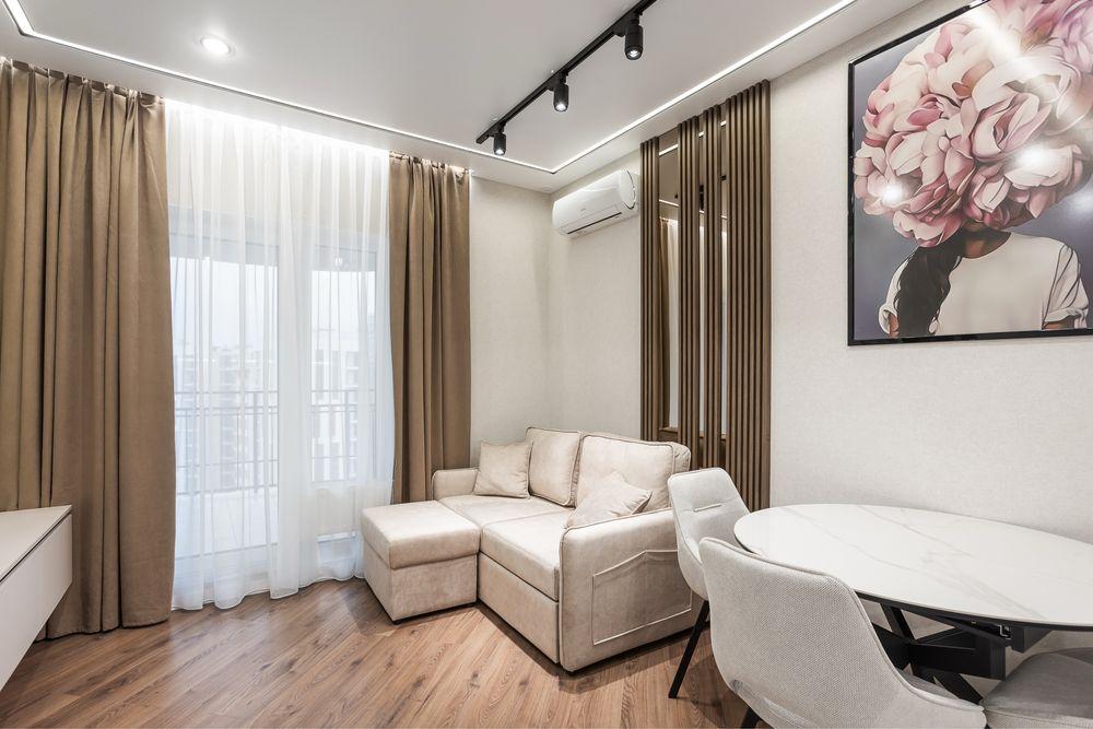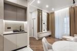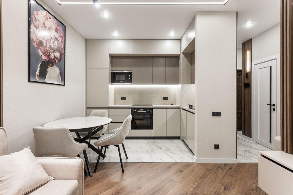 Грамотно спланировано пространство - кухня -гостиная и отдельно спальня. Техника и мебель высокого качества,которые вмещают в себя ниши для хранения вещей.
