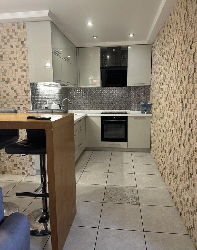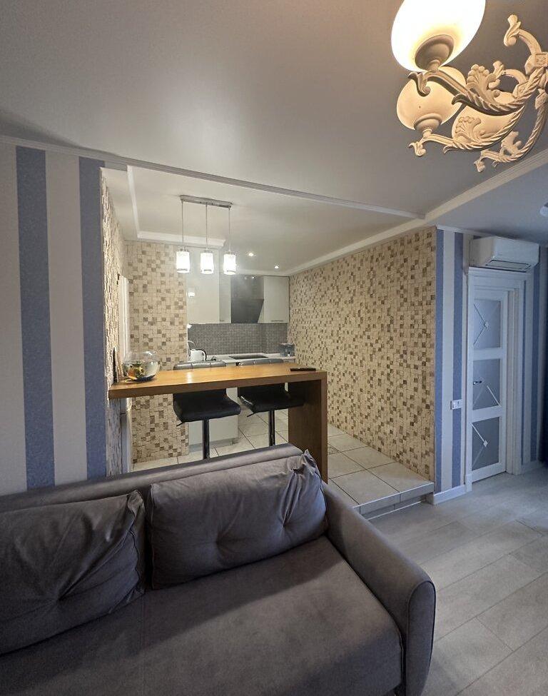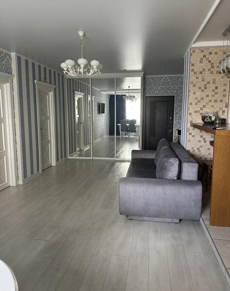 Квартира с кухней-студией, жилая площадь 35 кв. м, кухня 18 кв. м. Расположена на 5 этаже 19-этажного дома.