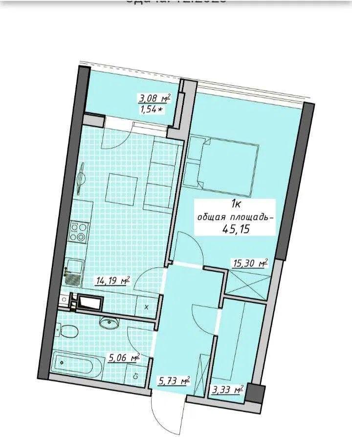 Кухня-студия площадью 14 м2 имеет выход на балкон, что делает пространство светлым и уютным, создавая идеальное место для утреннего кофе с видом на город или вечернего отдыха. Санузел большой и просторный.