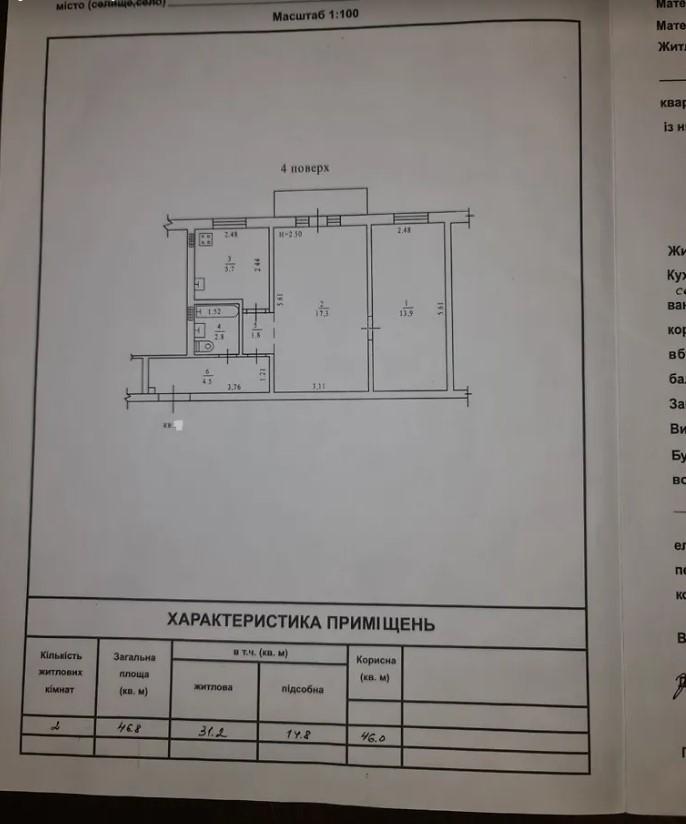 Этаж 4 из 5. Общая площадь — 48 м?, комнаты смежные, кухня 6 м?. Санузел совмещённый, застеклённый балкон.