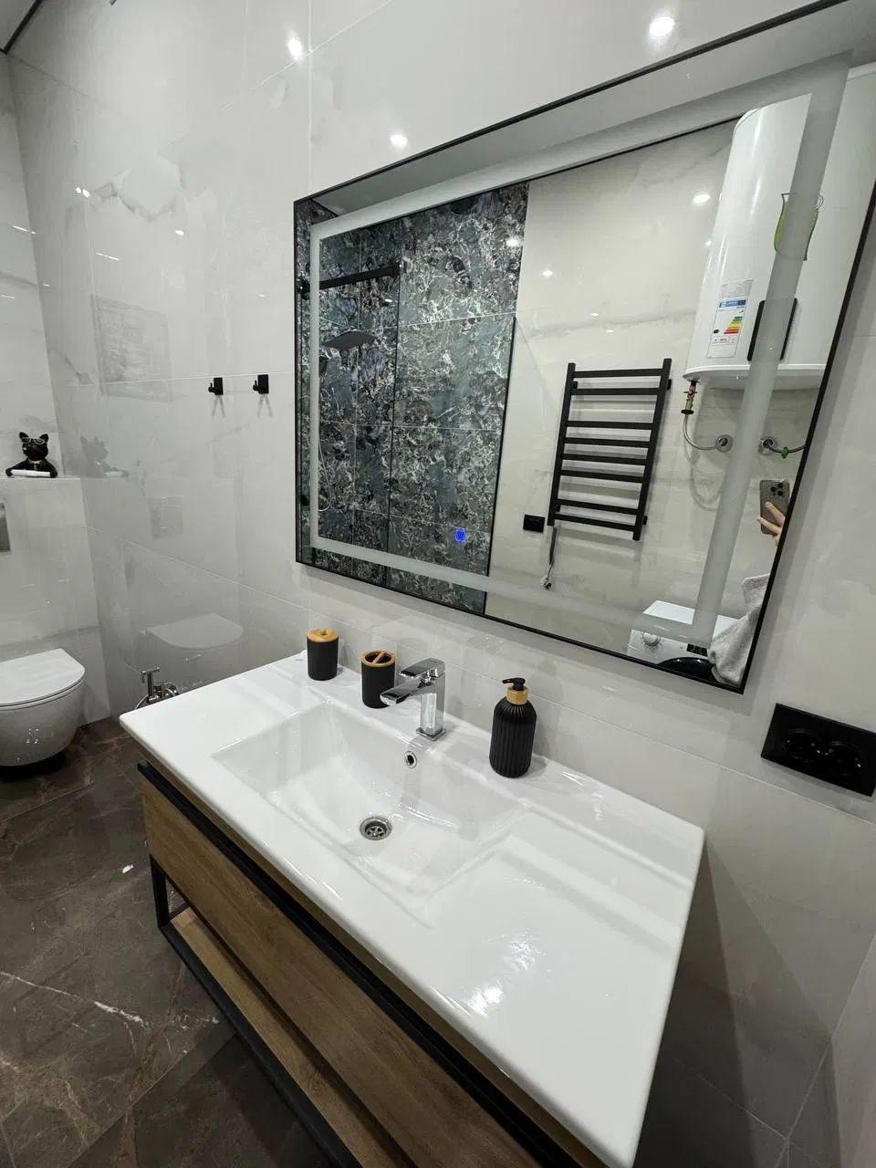 В квартире выполнен качественный ремонт с использованием дорогих материалов, вся мебель изготовлена по индивидуальному проекту, что делает пространство продуманным и уютным.