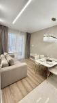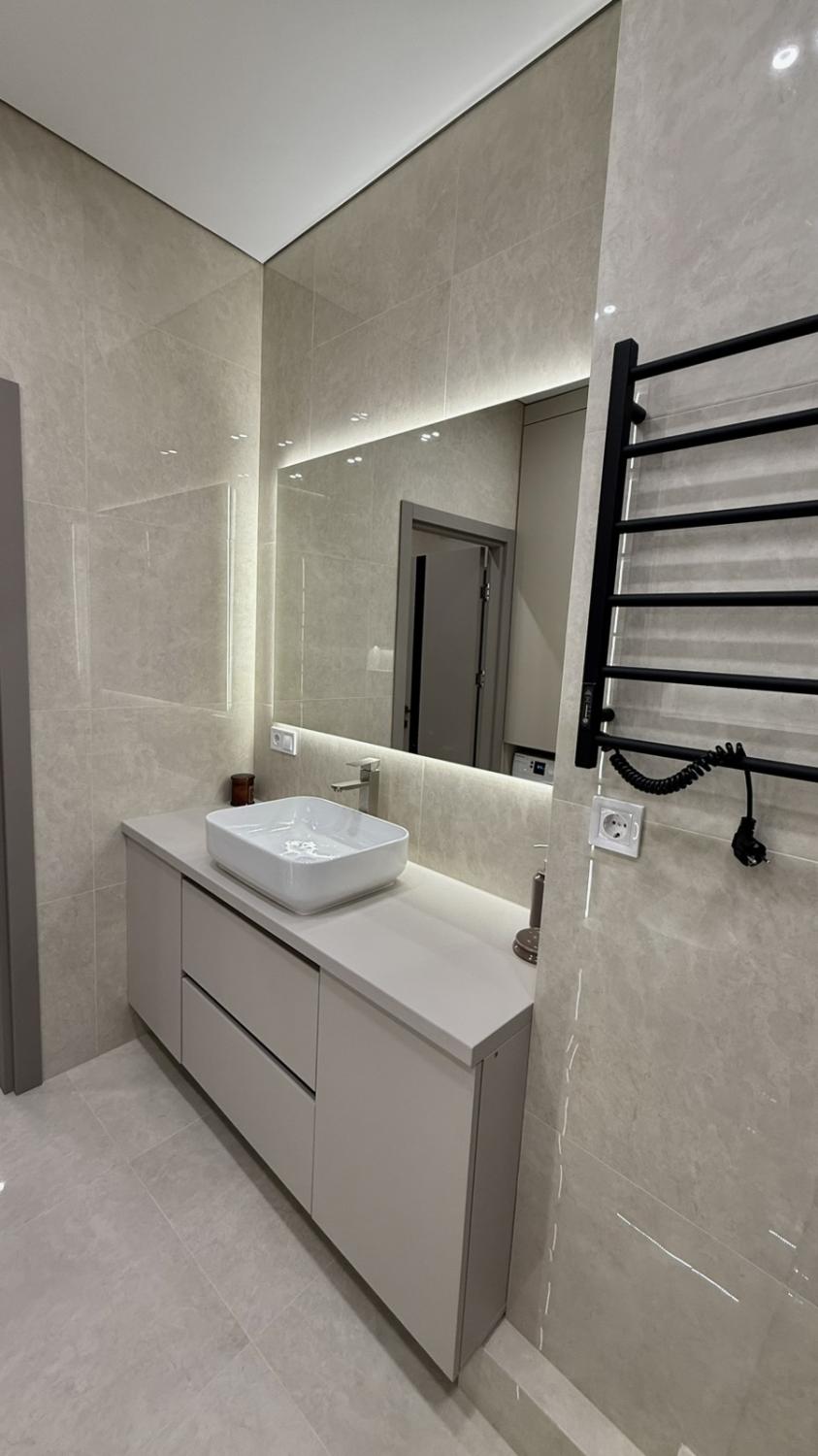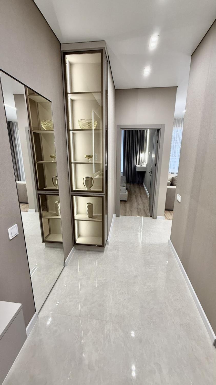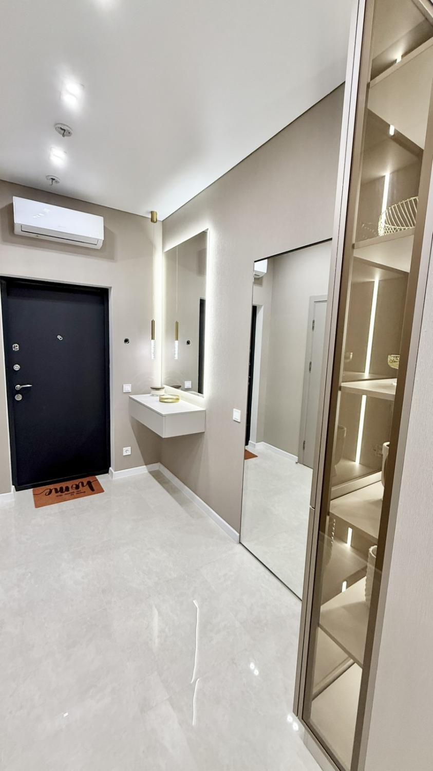 В квартире сделан дизайнерский ремонт с современными материалами, тёплыми оттенками и продуманными решениями для хранения.