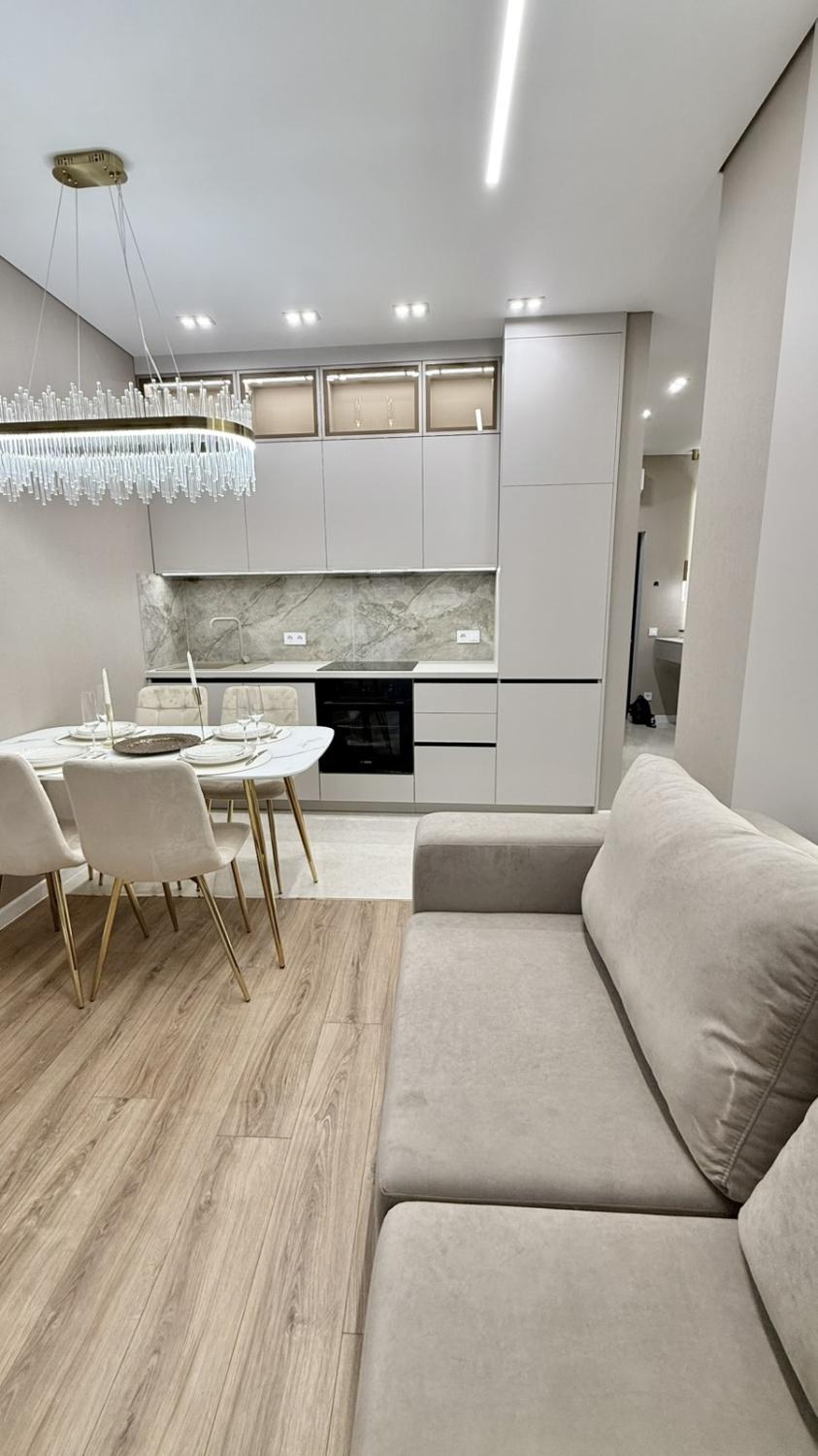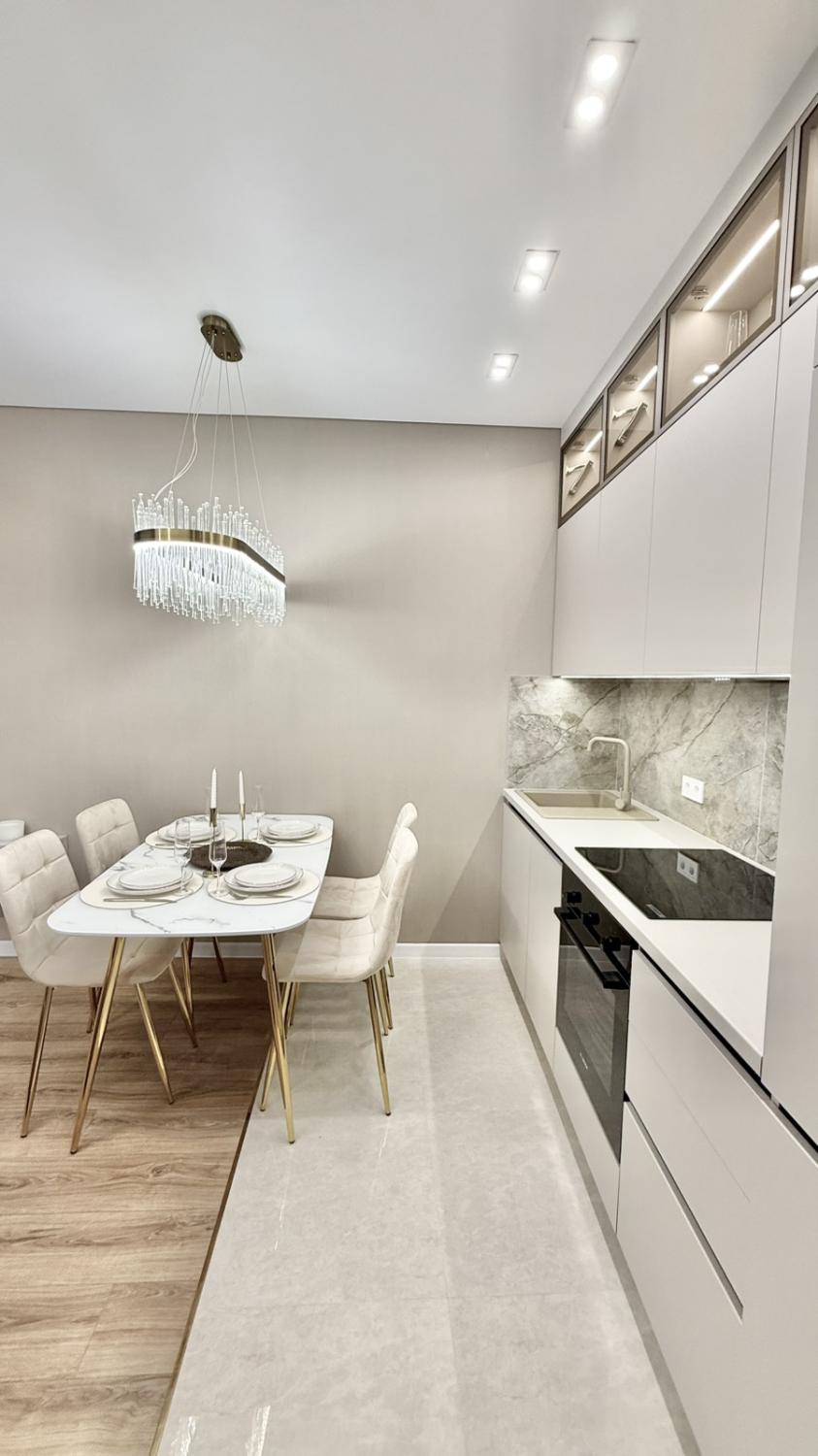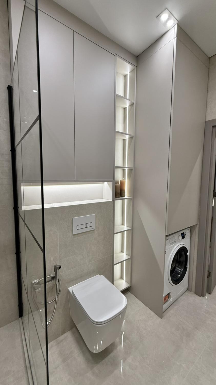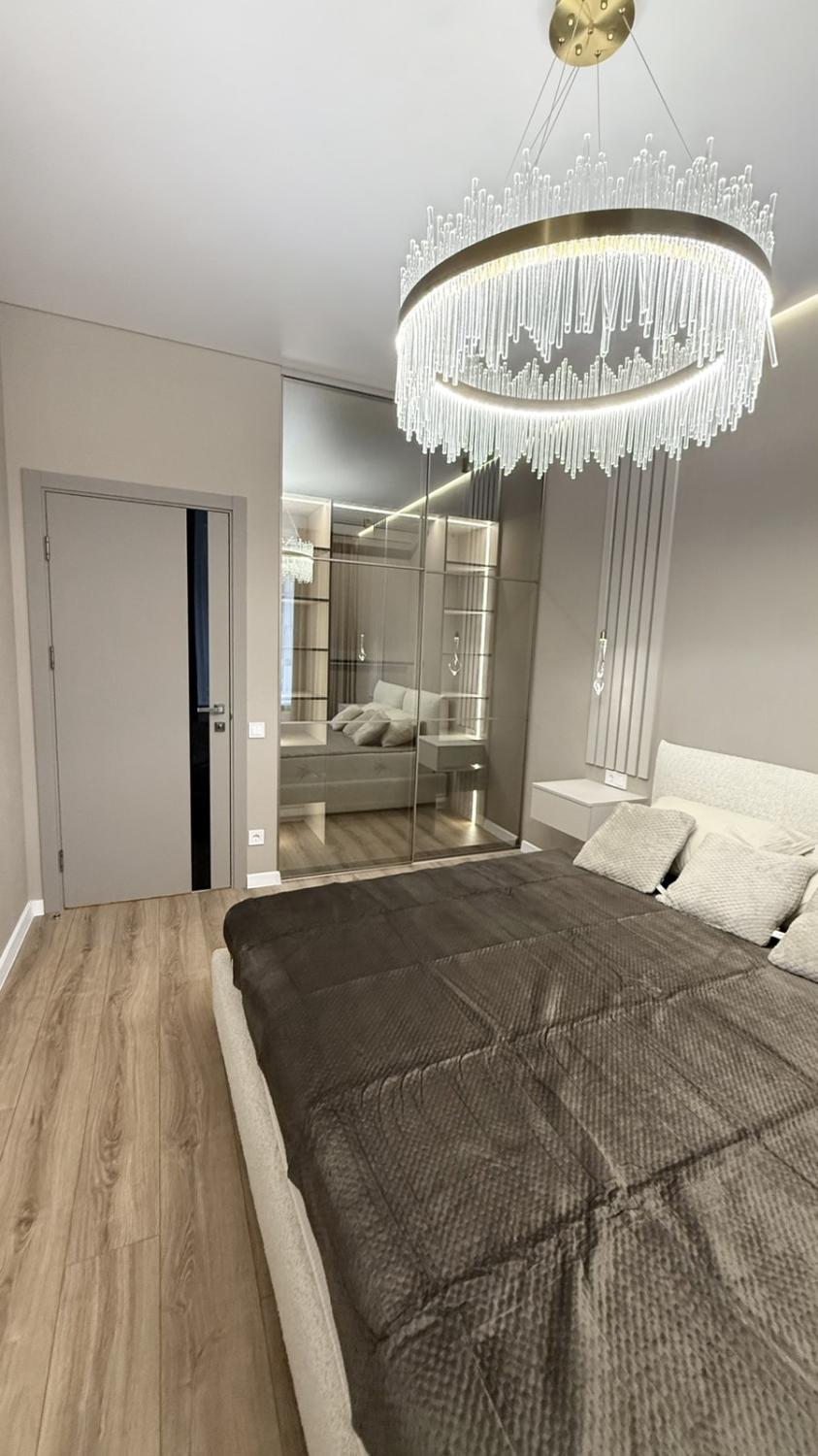 В квартире сделан дизайнерский ремонт с современными материалами, тёплыми оттенками и продуманными решениями для хранения.