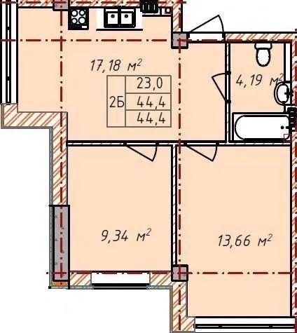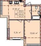 Общая площадь: 44.40 м² Площадь кухни: 15 м²