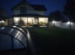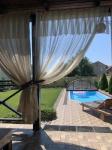 Выгребная яма. Рулонный газон, ландшафт, система автоматического полива. Крытый бассейн, на террасе мангал, мойка, садовая мебель.
