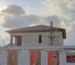 Стены- газобетон, крыша- битумная черепица хорошего качества, свет и вода подведены. Залит фундамент под забор.