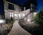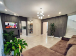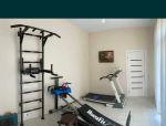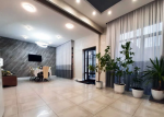 Прихожая с морским аквариумом, огромный холл, и кухня-студия с выходом во внутренний дворик. Гардеробная. Тех. помещение с ёмкостью воды на 1500 литров и гидроформ. С/У с душевой зоной, мойдодыром, и выходом под стиральную машину. Спортзал. Кладовая. Потолки первого этажа - гипсокартон с элементами волн и уровней.