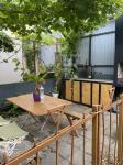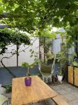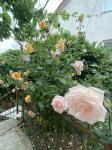 Ухоженная территория с цветущими розами и зелеными насаждениями. Беседка для барбекю с летней кухней