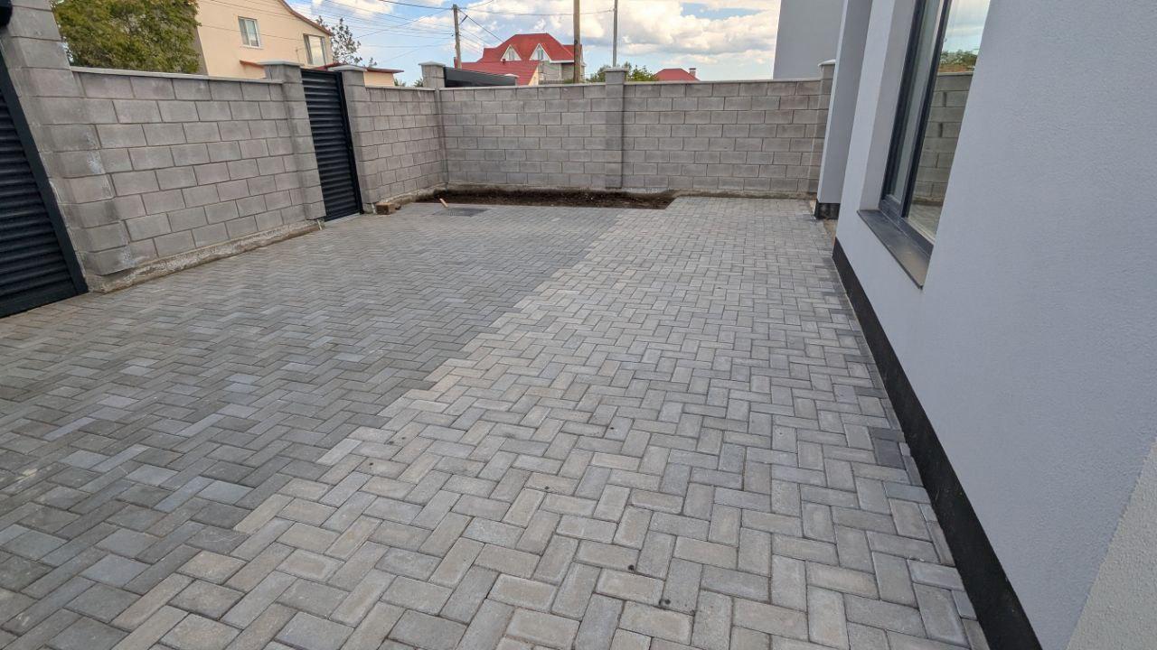 Двор выложен плиткой.