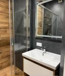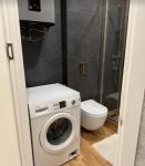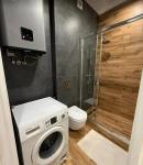Современный санузел: инсталляция, душевая кабина, стиральная машина — всё новое, всё работает идеально.