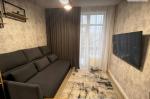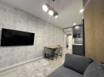 Стильная студийная зона: уютный диван, современная кухня, телевизор — идеальное место для вечеров дома.