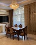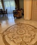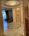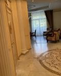 При входе вас встречает круглый холл с великолепным резным панно на полу и роскошной хрустальной люстрой на потолке. Просторная кухня-гостиная площадью 40 кв. м оборудована резным столом на шесть персон, а также диваном и креслами с декоративной резьбой.