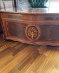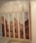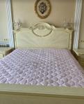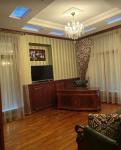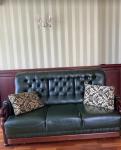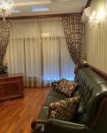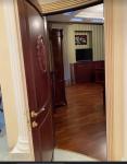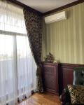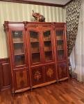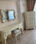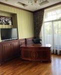 Вся мебель из натурального дерева, украшенная изысканной инкрустацией. В кабинете имеется кожаный диван и кресло. В спальне гарнитур с резными элементами, плюс встроенный шкаф, который гармонично сливается с интерьером. Потолок спальни украшен художественным витражом с подсветкой, создающей уютную атмосферу.