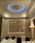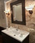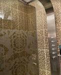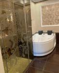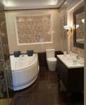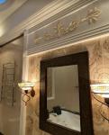 В ванной комнате установлено джакузи и душевая кабина с морской галькой на полу для массажа ног. Также ванная оборудована пятью видами освещения, а узоры на стекле душевой кабины повторяют декоративные элементы плитки. Лепные колонны в холле, пилястры в спальне и ванной изготовлены из гипса, добавляя интерьеру роскошности.