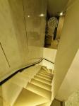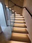 Элегантная лестница на нижний уровень с подсветкой, добавляющей шарма интерьеру.