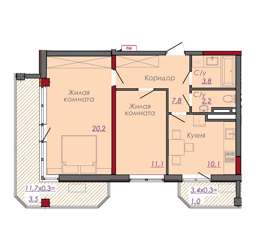 Планировка правильная и удобная: просторные комнаты, функциональная кухня, два балкона, которые наполняют квартиру светом и позволяют наслаждаться свежим воздухом и видом на ухоженную зеленую территорию комплекса.