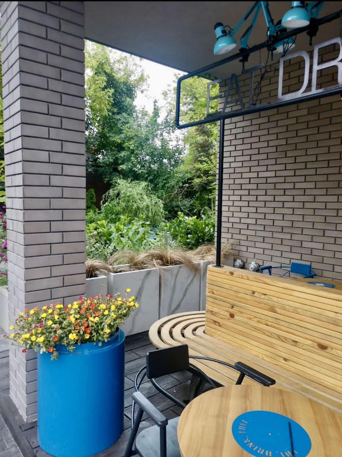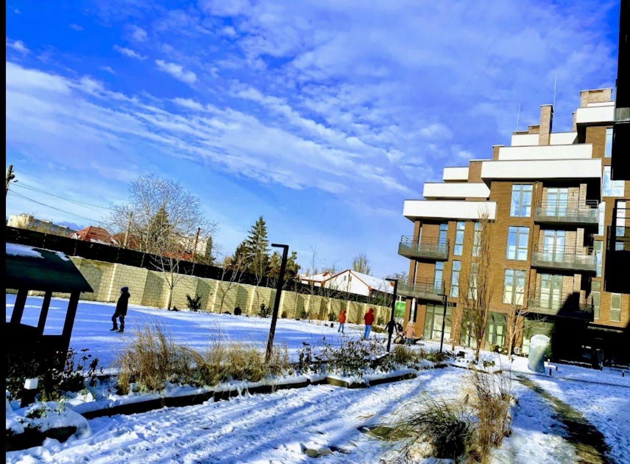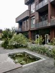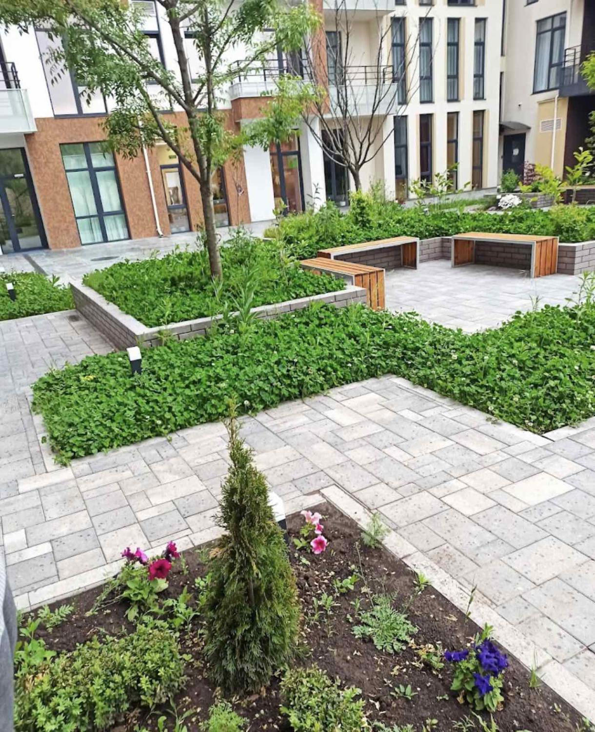 Очень ухоженная и облагороженная территория жилого комплекса с множеством зелени и зон для отдыха.