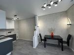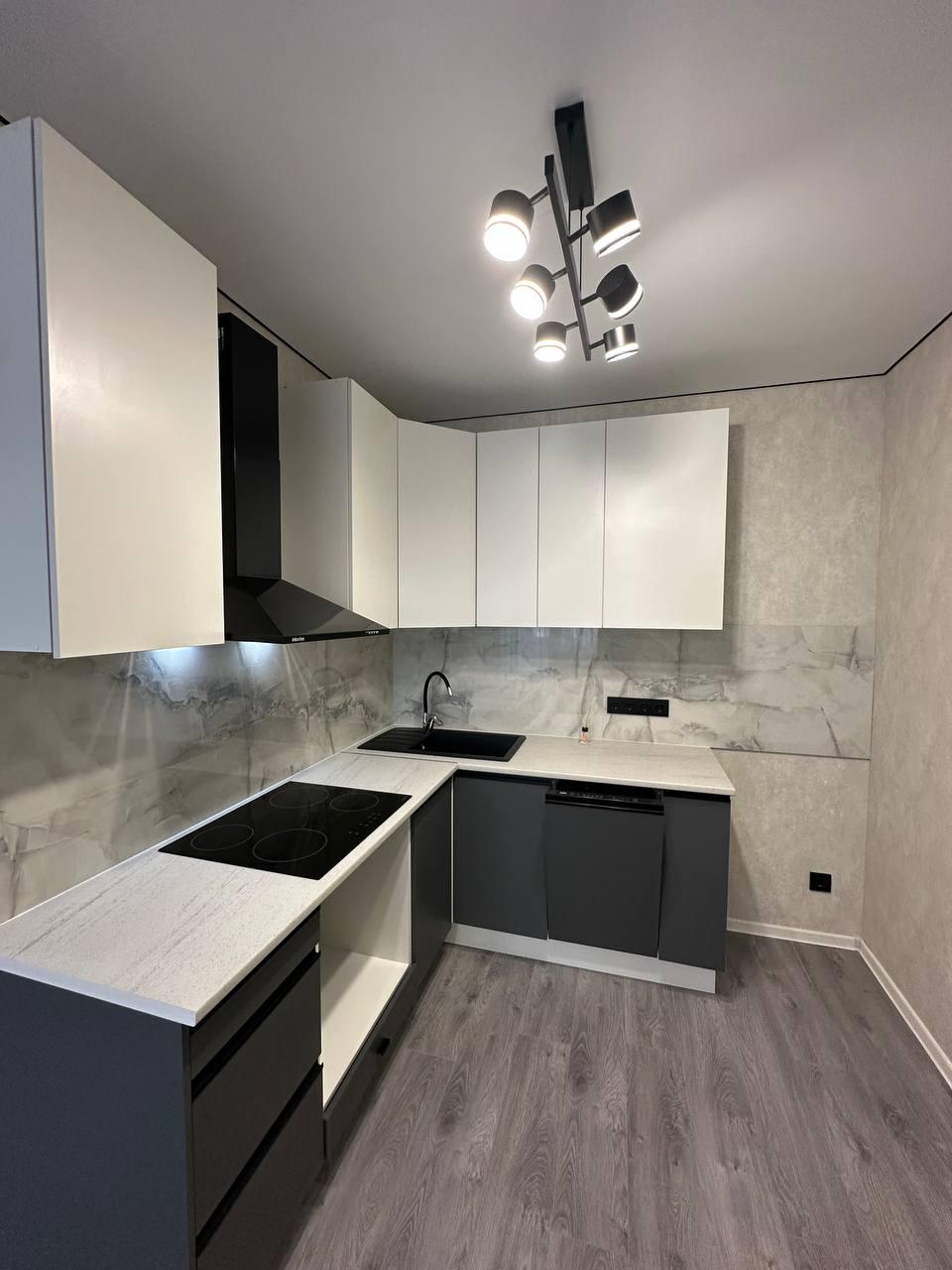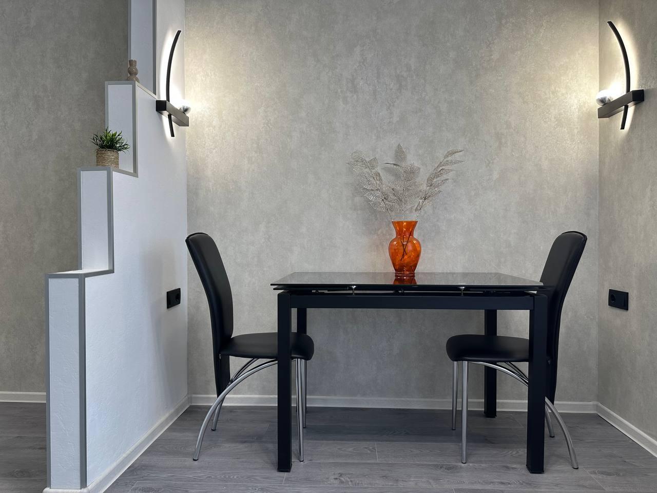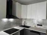 Из мебели: встроенная кухня и новый стеклянный стол со стульями. Установлены : индукционная плита, вытяжка, посудомойка.
