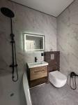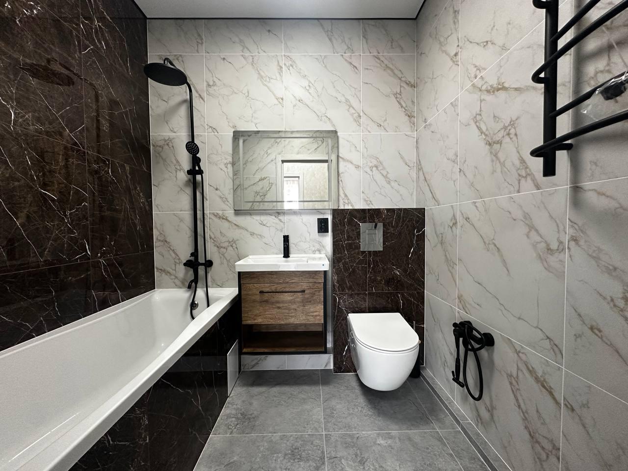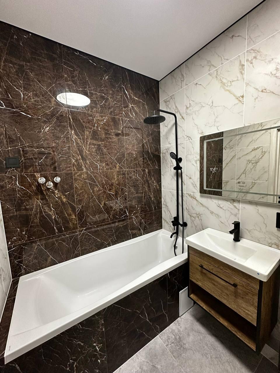 Санузел выполнен в дизайнерском стиле (природные теплые тона). Микс плитки : контрастное сочетание керамогранита . Гармонично смотрится с элементами дерева и черной сантехникой ( тростниковый душ ). На полу матовая плитка (не скользит ).