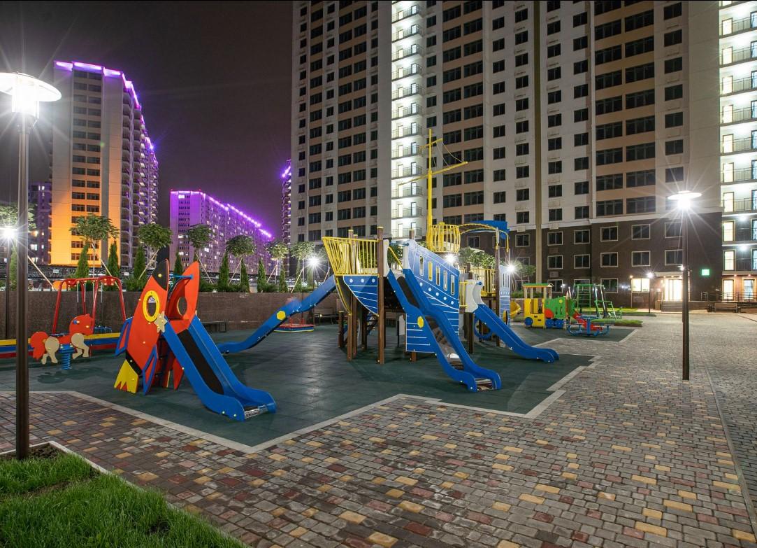 Во дворе предусмотрены зоны для отдыха и прогулок, детские и спортивные площадки, что делает комплекс удобным как для семей с детьми, так и для молодых пар.