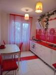 Кухня в красно-белых тонах, газовая плита, бойлер, холодильник.