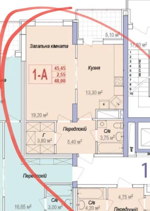 Зручне планування: простора кімната 19 м², велика кухня 13 м² та широкий балкон, який можна облаштувати під зону відпочинку або робочий простір.