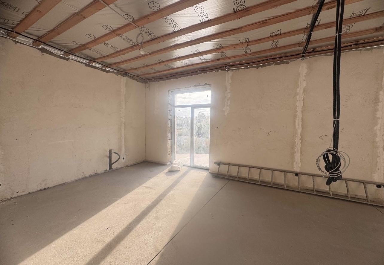 Крыша покрыта керамической черепицей, фасад утеплён и облицован травертином, уже выполнена покраска.
