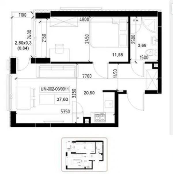 Площадь квартиры 38,56 кв м, кухня 20,5